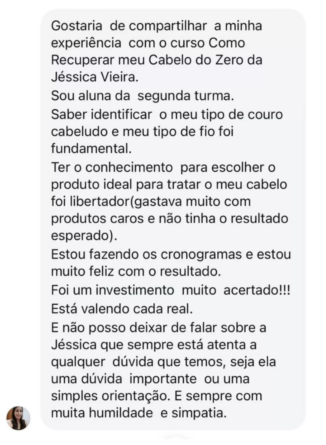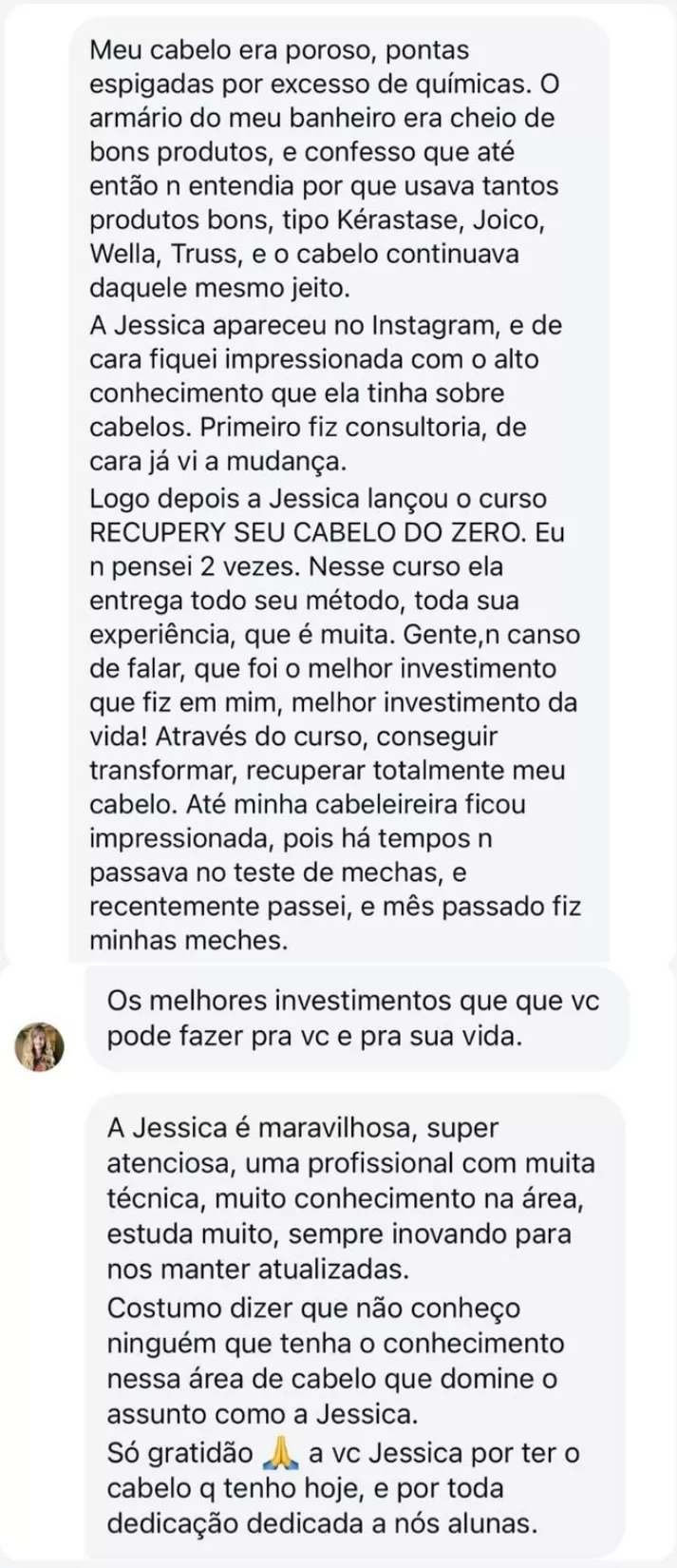 Prazer, eu sou a Jessica Vieira e Terapeuta Capilar, graduada em diversos cursos das maiores marcas Mundiais no segmento de cuidados com o cabelo. Minha maior virada de chave foi vender produtos no atacado para os melhores salões de Brasília e vivenciar, na prática, o atendimento ao profissional da beleza e ao cliente final. A partir disso, me especializei em Consultoria Capilar Personalizada, tanto no Brasil quanto no exterior, conquistando uma agenda cheia. Hoje, ministro cursos para profissionais da área da beleza a montarem suas próprias consultorias. E esse caminho me permitiu descobrir meu amor e propósito por transformação capilar.