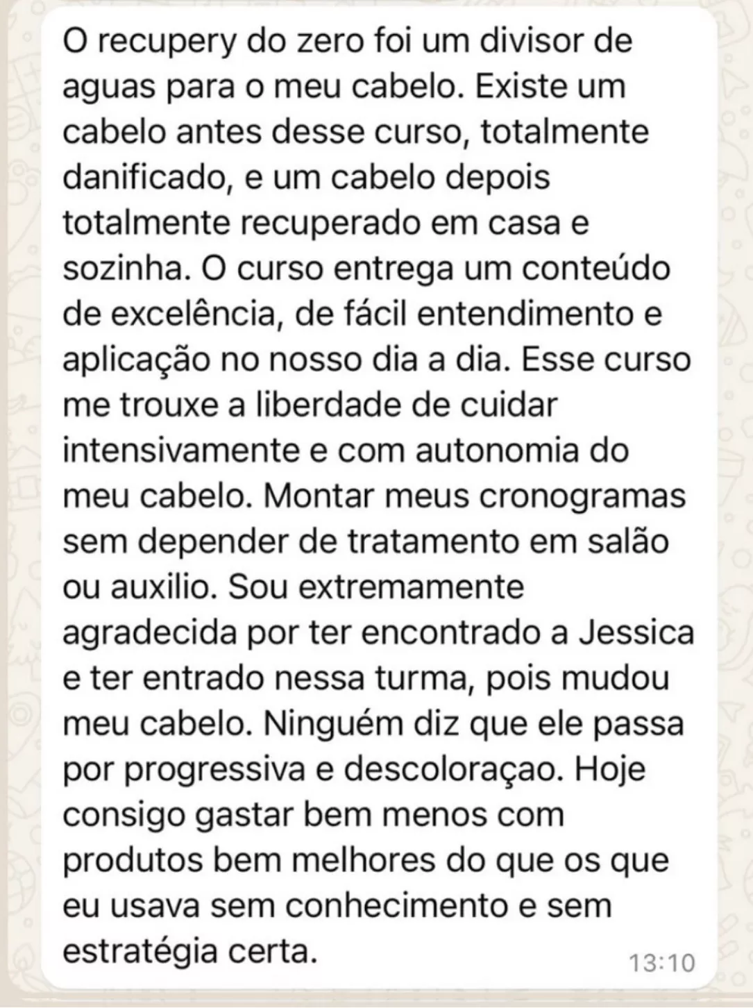 Agora imagine acabar de vez com esse ciclo de frustração. Com o Método RECUPERY, você vai dominar uma rotina simples e eficaz, que traz resultados de verdade. Você vai economizar tempo e dinheiro, aprendendo a cuidar dos seus fios de forma autônoma e sustentável.